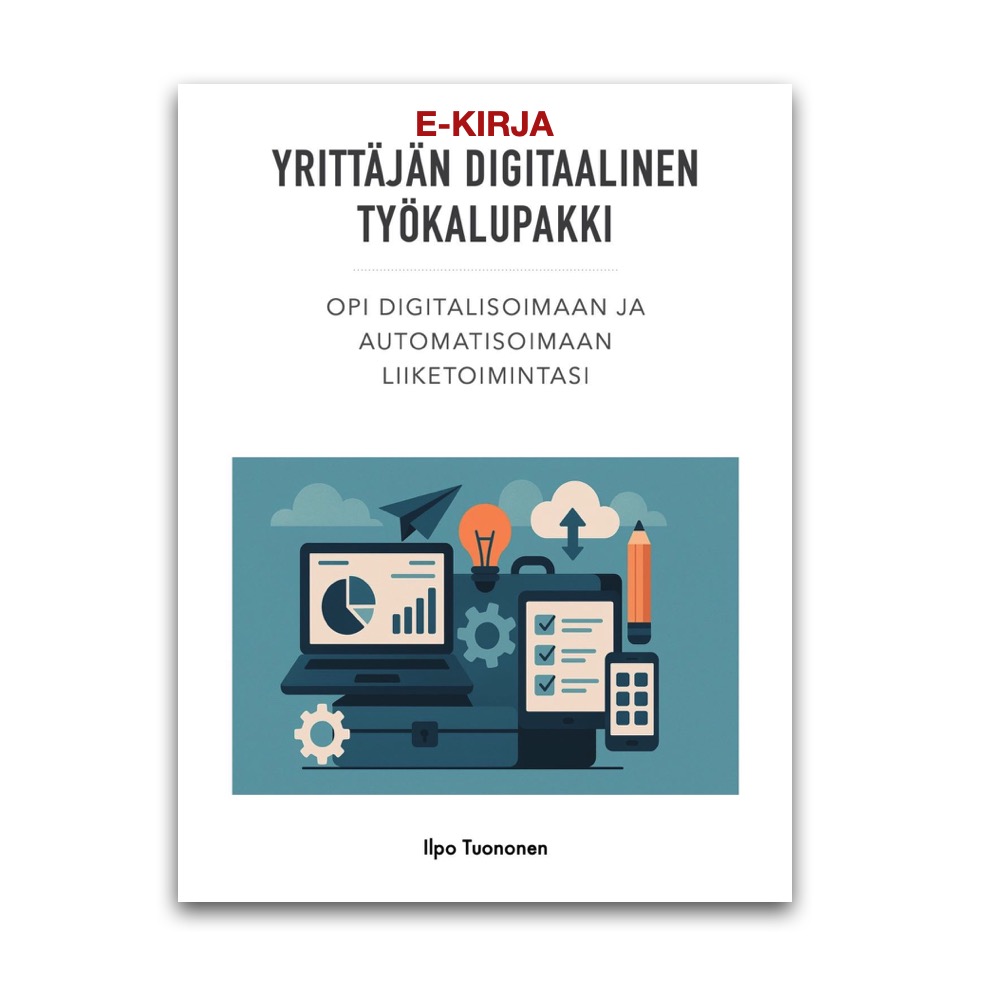 Käytännönläheinen 32-sivuinen e-kirja (PDF) pienyrittäjille, jotka haluavat digitalisoida ja automatisoida liiketoimintansa — perustiedoista käytännön toteutukseen.